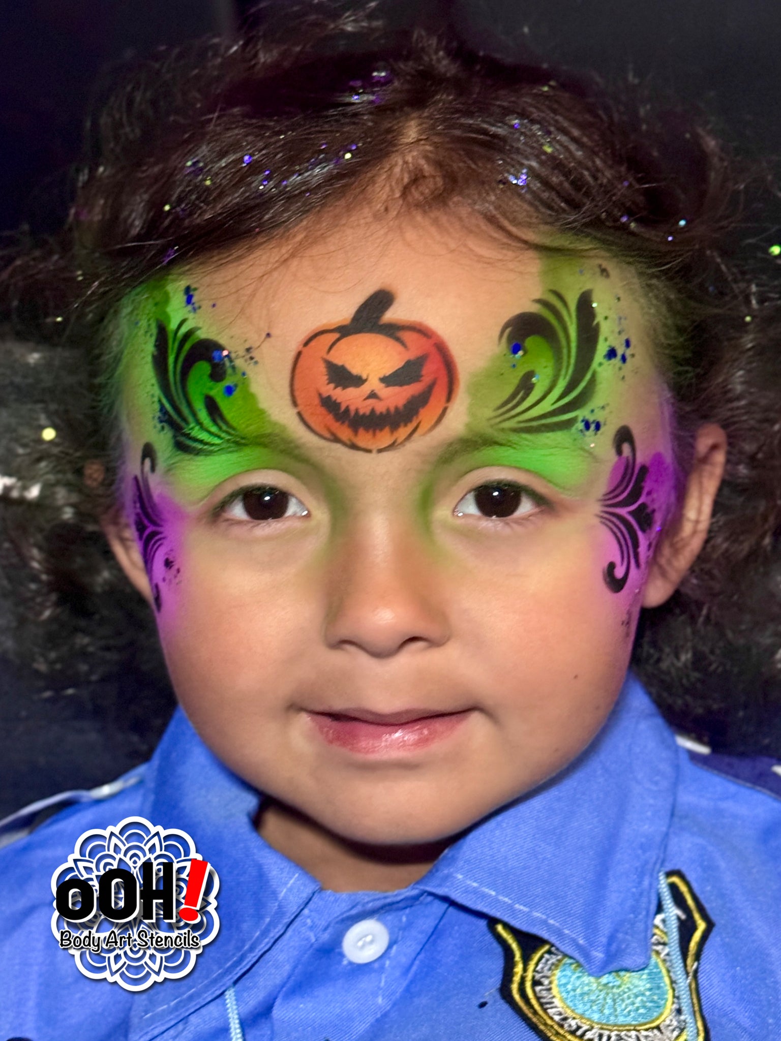 You get 2 sets of jack-o-lanterns in this pack, each with different faces. The 3-face set are 1.8" designs, the 4-face set are 1.4" designs so you have options for smaller arms/faces as well.