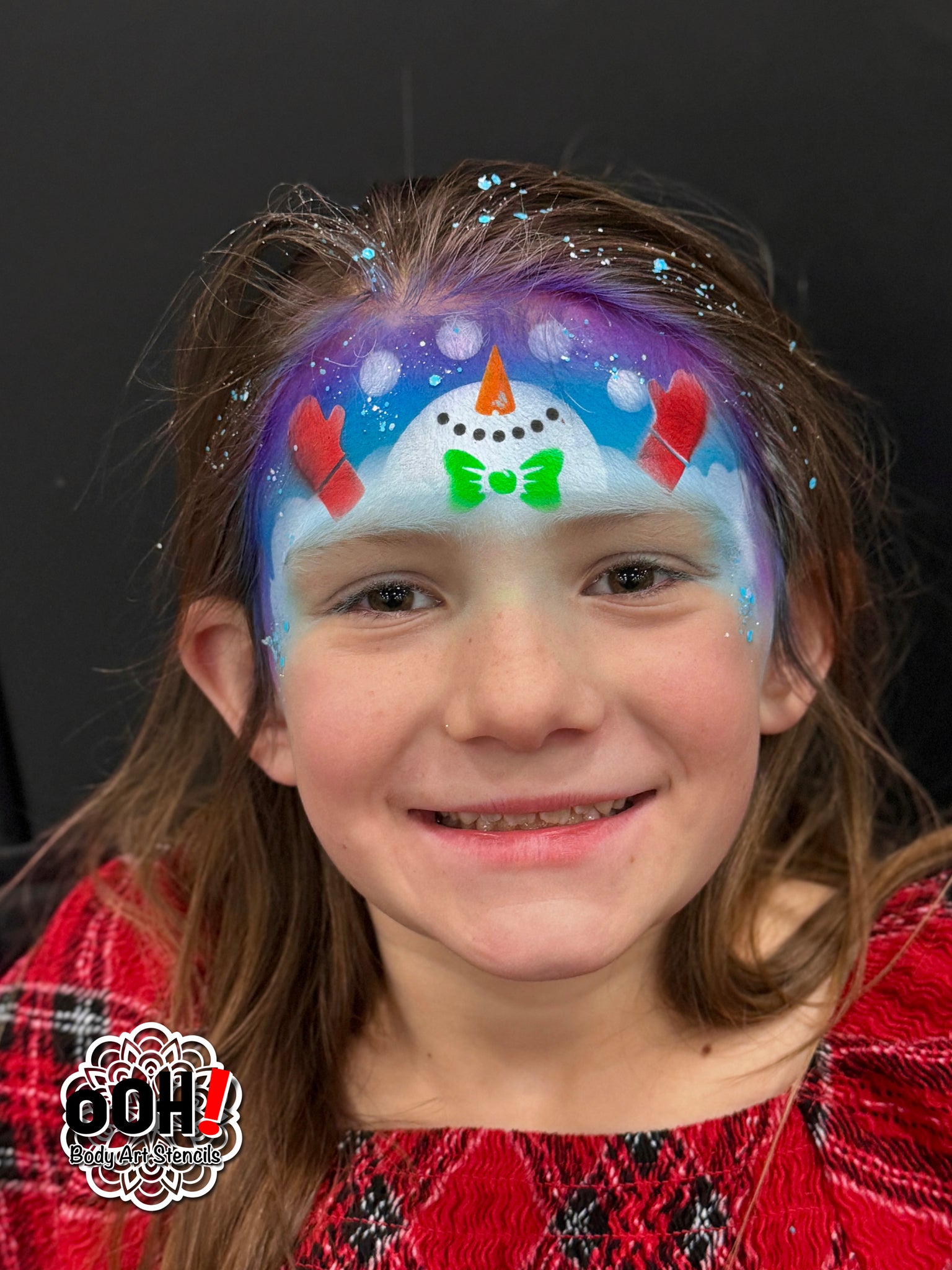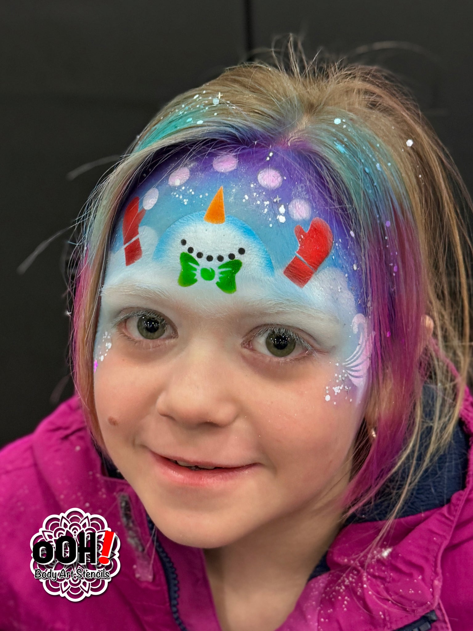 Create a quick snowman face paint design with this easy to use Snowman Stencil. Don't forget to pick up a cloud ring stencil and Gleam to complete the design.